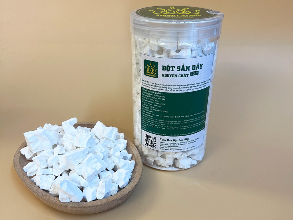 Bột sắn dây nguyên chất là sản phẩm được chế biến từ củ sắn dây tự nhiên, không pha tạp chất, đảm bảo giữ nguyên hương vị và giá trị dinh dưỡng. Bột sắn dây nguyên chất có màu trắng tinh, mịn màng, vị ngọt nhẹ và thường được sử dụng trong ẩm thực cũng như y học cổ truyền.
